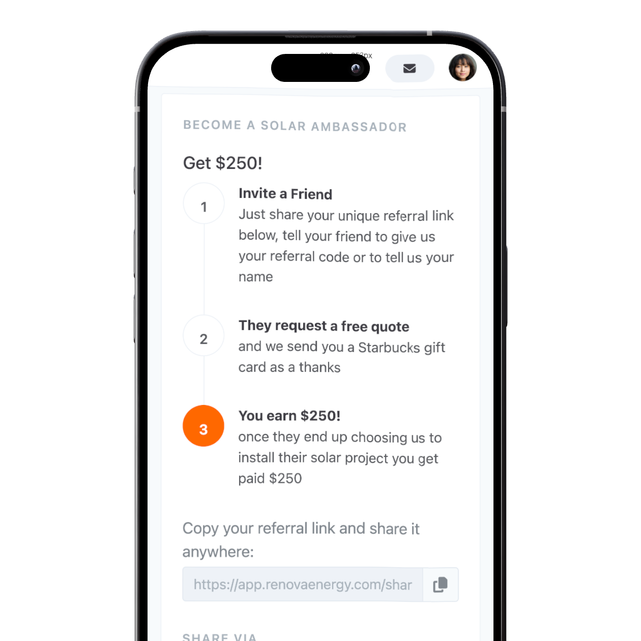 Have you been happy with Renova Energy? Refer a friend or family member conveniently by sending their contact info through the app or sharing your personalised referral page with them and earn money as a thank you.
